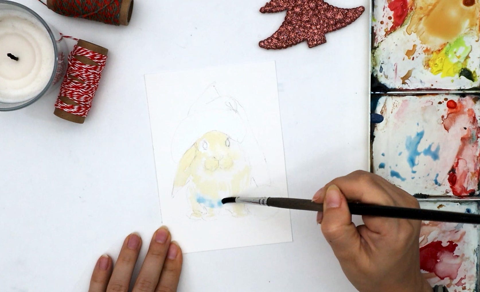 Right before the watercolor part, lightly go over the sketch with a kneadable eraser to remove the darkest lines. The bunny is light, so you want to avoid dark graphite pencil lines shining through the watercolor layers.