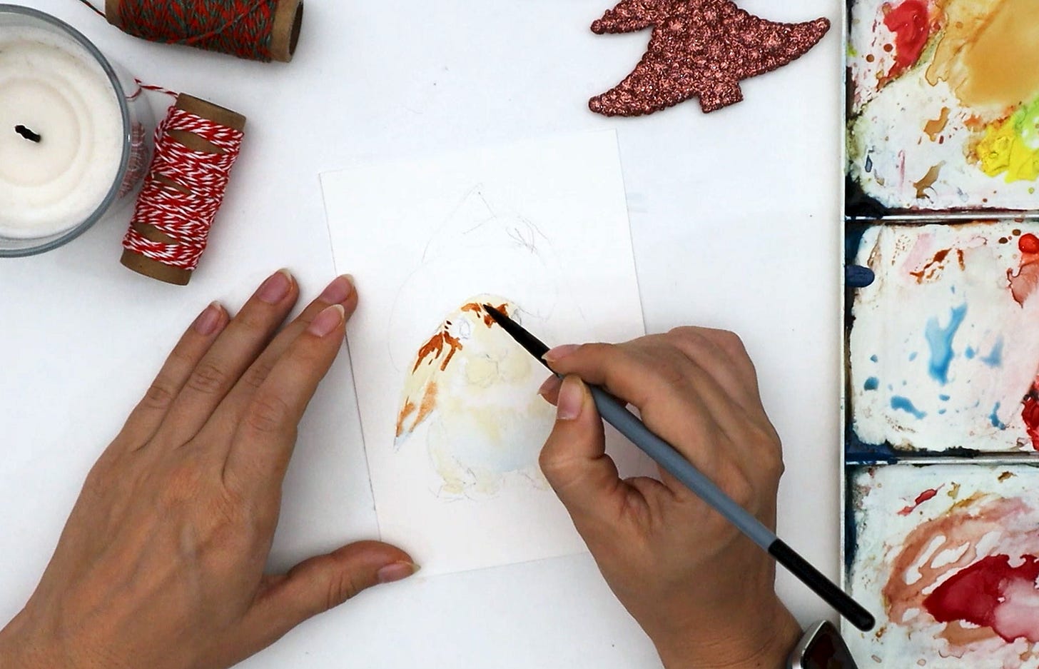 First, apply clean water on the bunny to prepare the area for a wet-on-wet technique.