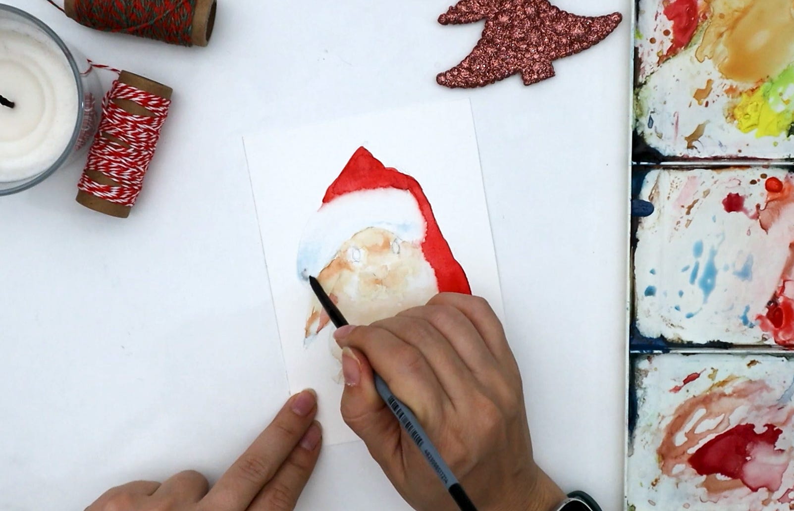 While the body is getting dry, we can work on the Santa hat. Take Bright Red and cover the hat altogether. When the hat is painted, work on its fluffy texture: take a semi-wet brush and carefully touch and blend the red edge. It will soften the line and give this a fluffy look. Make sure the red paint does not leak inside the white, fluffy part of the hat.